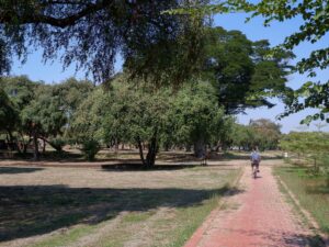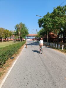 Le lendemain nous partons pour la visite des temples à vélo. Le chemin ne se fait pas sans peine, nos vélos sont loin d’être des vélos de compétition et entre la chaleur, la conduite thaï et les chiens errants c’est un peu fatiguant. En parlant des chiens justement, (petite pensée pour toi Colombe), nous nous sommes faits courser par plusieurs chiens errants. Les crocs de ce méchant molosse étaient très très proches des pieds de Nico. Votre seule porte de sortie : pédaler à toute vitesse, ils ne sont pas très endurants. J’ai aussi opté pour un gros bâton au cas où, on se rassure comme on peut. (Là tout de suite, on est assez content d’avoir choisi de se faire vacciner contre la rage).