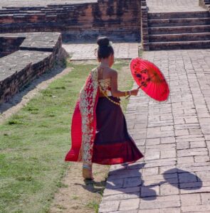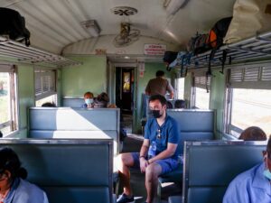 Nous avons visité beaucoup de temples durant ces deux jours, à présent nous allons en voir un dernier sous la lumière du soleil couchant. Nous rencontrons aussi un rassemblement de propriétaires de perroquets, dont 6 beaux aras bleus. Ils sont majestueux, partant du bras de leur maître et formant des grands cercles, parfois au ras du sol. Avec en fond de scène les temples et le soleil couchant, c’est grandiose ! Après une tentative de recherche du marché de nuit d’Ayutthaya (qui sera malheureusement fermé…) nous nous dirigerons vers la gare : ce soir c’est train de nuit jusqu’à Chiang Mai au nord du pays ! Train couchette, cabine double première classe, privée, climatisée, grand luxe 😉 Après un peu d’attente à la gare, nous embarquons ! La cabine est toute petite mais propre et bien aménagée. Est-ce qu’on a bien dormi ? Oui nous avons dormi mais on a une peu le sentiment d’être secoué comme des bananes et l’odeur du gasoil n’est pas toujours très agréable (les trains roulent au diesel). Cependant quel plaisir au matin de se réveiller au milieu de la jungle… Puis très vite Chiang Mai se dessine.