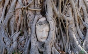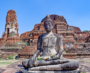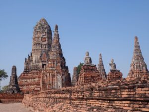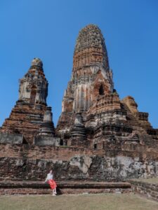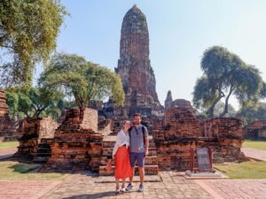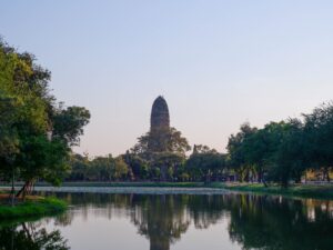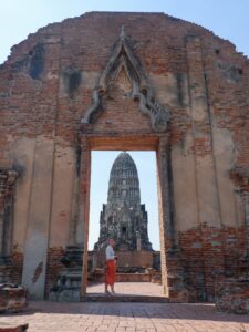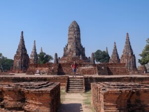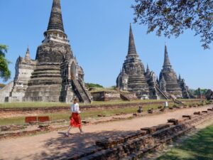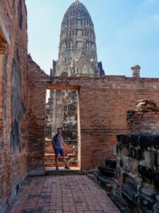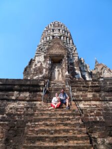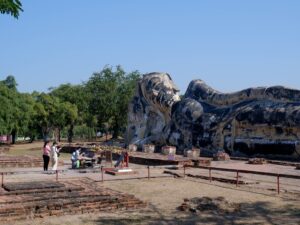Les premiers temples commencent à se dessiner. Nous sommes bien loin des temples clinquants et rutilants de Bangkok. Non ici vous êtes plusieurs siècles en arrière. Ayutthaya est fondée au XIVe siècle et ses ruines sont spectaculaires et envoutantes, toutes de briques. Les temples thaïlandais se composent globalement toujours de la même manière : Vous avez un prang central (sorte de grande tour sculptée) entouré d’une ancienne galerie et qui accueillent des lignes de bouddhas. Tout autour, vous avez de multiples cheddis (galbés à la base et qui pointe vers le ciel) mais aussi des structures rectangulaires qui servaient de salle de culte. L’état des temples d’Ayutthaya semble assez préoccupant, les structures ne sont pas très stables, les tours penchent régulièrement (coucou Pise). Ayutthaya est située sur une zone particulièrement inondable, les sols sont assez mobiles. De même il ne reste presque plus grand-chose des sculptures et des formes qui devaient enrichir le lieu. Il y a quelques dizaines d’année les archéologues ont choisi de créer des coques de bétons pour entourer les parois des monuments et les stabiliser ou alors pour totalement récréer la structure perdue. Une fois de plus nous ne sommes pas gênés par le monde, la plupart du temps nous pouvons profiter de ces espaces majestueux sans rencontrer personne. On déambule à travers les cheddis, le long des galeries de buddhas, on gravit les prangs, offrant des points de vue sur la ville. L’ambiance est majestueuse et assez mystérieuse.