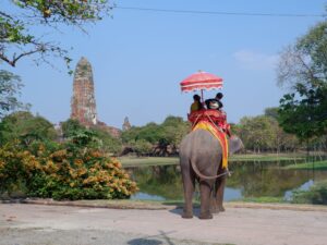 C’est à Ayutthaya que nous voyons les premiers éléphants de Thaïlande, ils sont magnifiques habillés de leurs ornements rouge et or, faits pour épater le touriste. Nous avons pu lire quelques articles sur la façon dont les éléphants sont traités dès le plus jeune âge pour qu’ils perdent leur instinct animal et qu’ils soient entièrement dociles avec l’homme, ce sont des pratiques particulièrement cruelles.