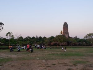 Ayutthaya step ! Voici le récit de ces trois derniers jours. Nous sommes partis pour Ayutthaya, l’ancienne capitale de la Thaïlande, qui ne contenait pas moins de 375 temples. Nous avons choisi de prendre le train pour nous y rendre, environ 1h depuis Bangkok. La gare de Bang sue de Bangkok depuis laquelle nous partons est typique, comme on les imagine dans les films et dénote totalement avec l’énorme complexe de la taille d’un stade qui s’est construit juste à côté et qui accueille le métro. Les trains sont eux aussi très traditionnels, vieillots mais propres. En 3e classe, les places sont serrées et avec cette chaleur nous sommes heureux de ne pas avoir trop de monde. Le trajet reste très agréable, les fenêtres grandes ouvertes. Arrivés à Ayutthaya, nous filons directement à notre hôtel « Ayuttahaya Retreat » légèrement à l’extérieur de la ville. L’endroit est absolument charmant, il s’agit d’une ancienne maison nobiliaire en bois traditionnel, qui s’est développée autour d’un point d’eau. Le gérant a cherché à recréer l’ambiance des petits ports de rivières thaïlandaises, en plus cosy. A notre grande joie, la cuisine y est particulièrement bonne. Notamment pour ce qui est des desserts typiques thaïlandais, mais pas que ! Nous avons pu y manger une pizza à la pâte absolument incroyable et une tarte au citron à tomber par terre.