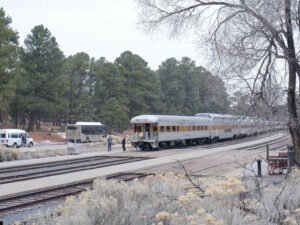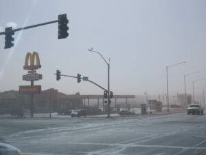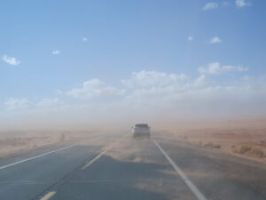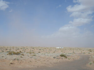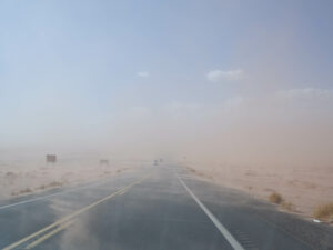 Il est temps de rebrousser chemin vers l’ouest à présent, direction le Grand Canyon ! Mais avant d’y arriver, il nous faudra affronter la route et surtout une tempête de sable. Cela faisait déjà plusieurs jours que nous avions pas mal de vent. Comme le sol est très sableux, dès que le vent souffle un peu trop la vision devient un peu moins claire et nous commençons à manger de la poussière. Ça a quand même pas mal soufflé, il y avait des moments où c’était sacrément impressionnant, mais une fois de plus Nicolas a bravé la tempête comme un chef. C’était aussi assez beau, le sable qui filait sur la route, les « tumbleweed » (si si, ces petits arbustes secs) qui déboulent comme dans les westerns.