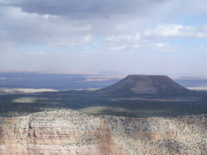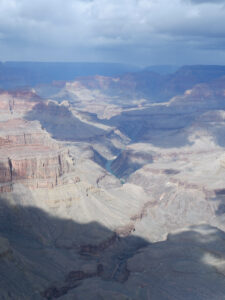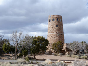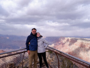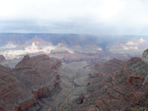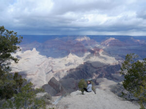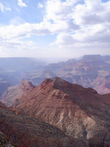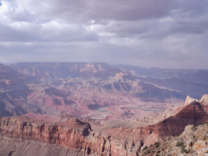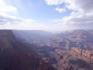Après ce passage mouvementé, nous atteignons le parc national de Grand Canyon. Nous nous garons au premier point de vue: Desert View. Comme à Bryce, le paysage se découvre peu à peu en s’approchant en voiture. Nous sommes sur une plaine et d’un seul coup sous nos pieds apparaît un gouffre immense. Le paysage se dévoile sous nos yeux tout d’un coup, ce qui rajoute un petit effet whaou. Nous avons vu jusqu’à présent beaucoup de paysages démesurés; de distances qu’on avait du mal à quantifier, mais rien par rapport aux dimensions hors norme du Grand Canyon. Il faut rester plusieurs dizaines de minutes et lire les panneaux pour essayer de se rendre compte des volumes, pour tenter de visualiser une échelle de grandeur. Cette gigantesque fosse, qui descend de plateaux en plateaux, au fur et à mesure jusqu’au fleuve. En effet, au fond du canyon on distingue le bras vert du « Colorado », avec parfois des traînées blanches qui indiquent des zones de remous. Mais de là où nous sommes, elles semblent immobiles, impossible de distinguer le moindre mouvement à cette distance. Pour que vous vous rendiez mieux compte des dimensions sur nos photos, le Grand canyon fait 1 800 mètres de profondeur, il faudrait empiler six tour Eiffel pour atteindre cette hauteur ! Je ne vous parle même pas sur combien de kilomètres ce gouffre s’étend. C’est assurément le paysage le plus hors norme que nous ayons vu aux États-Unis.