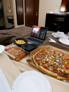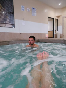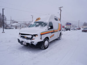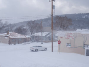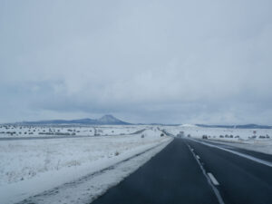 Après cette journée frisquette, nous prenons la route pour notre hôtel. Quel plaisir de découvrir qu’il dispose d’une piscine chauffée et d’un jacuzzi à 38 degrés au plus grand bonheur de Sixtine. Nous terminons la soirée avec une pizza et un film, le bonheur ! Dehors la neige commence à tomber… sur nos téléphones on nous alerte d’une tempête de neige, décidément nous avons bien fait de prendre un hôtel. Puis le jour se lève et dehors tout est blanc, la neige virevolte avec force un peu partout, de façon désordonnée. Il y a bien 30 centimètres d’épaisseur, et à certains endroits bien plus. Ce qui nous inquiète c’est que devant nous les routes ne sont pas vraiment déneigées… Nous n’avons même pas 2 minutes pour rejoindre l’autoroute, alors nous tentons ! Après avoir déneigé le van grâce à une pelle gentiment prêtée par l’hôtel, nous commençons les premières manœuvres: ça semble rouler et ça ne glisse pas trop. Doucement mais sûrement, nous nous engageons et facilement nous arrivons à la quatre-voies. C’est un joli bazar, des camions un peu partout sur le bas-côtés, on slalome pour nous insérer. La grande route est partiellement déneigée, nous sommes au touche-touche au milieu de quelques voitures et de beaucoup de camions. Au début, nous voyons des accidents presque tous les 100 mètres – mais que s’est-il passé pendant la nuit ? – régulièrement des énormes camions enfoncés dans la neige, à droite puis à gauche, dans une haie sur le bas-côté ou à la lisière d’un bois. Puis peu à peu la neige se calme, la route devient plus sûre et une petite heure après, la neige n’est plus qu’un mirage. Quel pays ! Nous sommes tout de même passés de la tempête de sable à la tempête de neige.