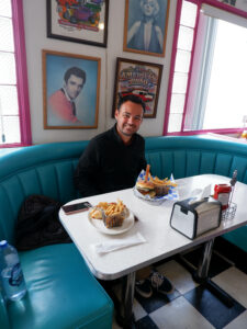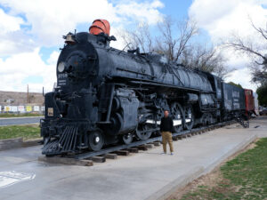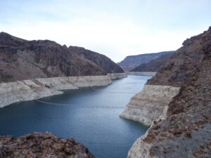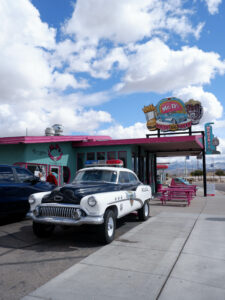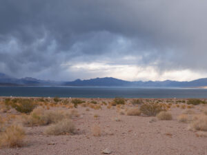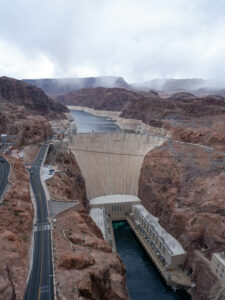 Ce soir nous dormons au lac Mead, sur la route nous nous arrêtons déjeuner à Kingman dans un « diner » très américain au style des années 60. Nico déjeune à côté d’Elvis Presley. Sur la place se trouve une ancienne tête de locomotive, le fameux cheval de fer qui traversa le far west. A vrai dire cette machine est assez impressionnante, nous n’imaginions pas ça aussi gros ! Rien que les routes font déjà la hauteur d’une personne ! Nous passons aussi voir le célèbre barrage Hoover qui permet la création du lac Mead et surtout la production d’une importante part de la consommation d’électricité de Las Vegas et de toute une partie du pays. Nous nous installons ensuite face au lac pour la nuit.