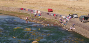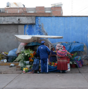 En fin de journée nous atteignons Puno, une ville toute de brique avec ses habitations pour beaucoup non terminées. Puno est authentique, pas vraiment touristique c’est plutôt le point de départ pour visiter le lac Titicaca et ses alentours. A la sortie du bus nous décidons de marcher jusqu’à notre hôtel pour se dégourdir un peu les jambes. Ce fut une bonne idée, nous tombons en plein milieu d’un grand marché. Authentique de chez authentique, nous touchons un peu mieux la vraie vie des péruviens. Nous avons souvent une image un peu stéréotypé d’une péruvienne avec ses nattes rassemblées dans le dos, son chapeau un peu haut de forme, une broderie croisée sur la poitrine, une lourde et volumineuse jupe et ses grosses chaussettes coincée dans des sandales… nous pouvons maintenant le dire, ce n’est pas un mythe ! De Cusco à Puno c’est en effet la tenue de tous les jours de beaucoup de péruviennes ! D’une manière générale nous sentons les péruvien très fiers de leur traditions et de leur savoir-faire.