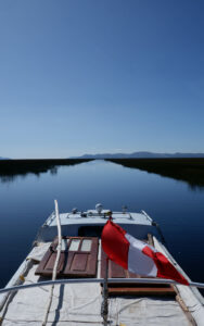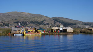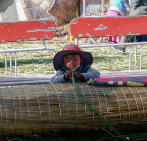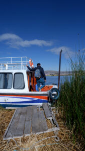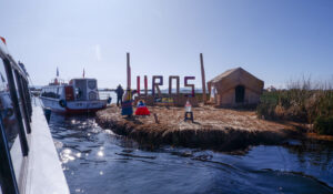 Après une bonne nuit, nous voilà matinalement sur le départ pour l’île Taquile où nous passerons les deux prochaines nuits. Chaque bateau se rendant à Taquile fait un stop aux Îles Uros que nous avons ainsi eu l’occasion de découvrir. Uros n’est pas une île classique, si vous allez sur Google Maps par exemple vous ne trouverez d’ailleurs que des points au milieu de l’eau. Les îles Uros sont des îlots flottants, construits de toute pièce par l’homme à l’aide de la « totora », une sorte de roseau (il y en a 89 sortes en tout). Installées dans cette zone où pousse le totora, les premières îles furent construites par les Uros au XIIIe siècle alors qu’ils tentaient d’échapper aux Incas. Au début, l’assemblage du totora n’était pas très stable mais en en rajoutant au fur et à mesure des années la base commence à s’agglomérer créant ainsi un sol très stable. Il faut savoir qu’aujourd’hui il n’y a plus d’Uros sur les îles depuis les années 50, ce sont maintenant les Indiens Aymaras qui les exploitent. Le totora ne sert pas qu’au sol, mais aussi aux habitations et embarcations… en forme de canard. Dernièrement les îles se sont essentiellement tournées vers le tourisme, certains disent que c’est devenu une sorte de Disneyland… il est vrai que le lieu a perdu de son authenticité.