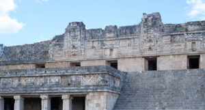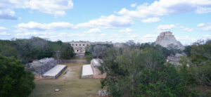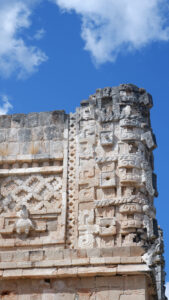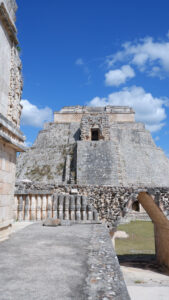 Après cet épisode, un peu stressant, il faut l’avouer, nous faisons une pause à la cité archéologique d’Uxmal, encore une ruine ! A Uxmal, nous profitons de nos premiers beaux ensembles sculptés mayas. Nous commençons à connaître les cultures maya, aztèque, olmèque ou toltèque grâce aux podcasts et à nos lectures sur les lieux que nous croisons. Sixtine a tout oublié de ses cours de culture précolombienne de la fac ! Elle a commencé à lire « Azteca » qui retrace l’histoire des Aztèques, un peuple non pas situé au Yucatan mais dans le centre du Mexique qui fut anéanti à l’arrivée des colons. Les sites que nous voyons sont mayas. Les Mayas connaissent leur apogée entre 300 et 800 après JC. Organisation sociale, religion et cultes, astronomie… une civilisation dont de nombreux aspects nous sont encore inconnus.