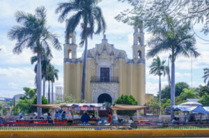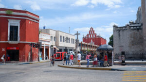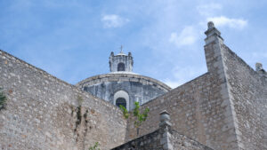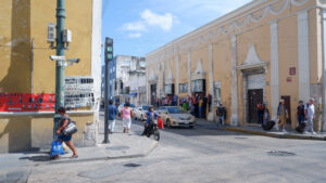 Le lendemain nous parcourons la ville sous une chaleur écrasante: 37 degrés et pas de vent. Une fois de plus le « zocalo » est le cœur de la ville, on y trouve une série de bâtiments anciens, avec de nombreuses sculptures, arcades et bas reliefs finement réalisés. La cathédrale de Mérida est la plus ancienne d’Amérique centrale, construite avec les restes des temples mayas. Nous profitons d’un spectacle son et lumière sur sa façade à la nuit tombée. Son histoire y est racontée, celle du temple précolombien (avant l’arrivée de Christophe Colomb) et celle de la cathédrale post colombienne. Ça nous permet d’en découvrir un peu plus sur le regard que portent les mexicains sur leur propre histoire. Comment abordent-ils cette double identité dont les origines prennent racines dans la violence ? L’histoire partagée sur les murs de la cathédrale par la mairie de Mérida est un discours apaisé et positif, une reconnaissance de cette histoire, de ces conflits et de ces deux civilisations qui ont tour à tour enrichi ce qu’est le Mexique aujourd’hui. L’histoire du pays ne se limite d’ailleurs pas à cette époque. Depuis les mexicains ont connu d’autres combats, avec les États-Unis, la guerre d’indépendance, les réformes paysannes, la guerre civile anticléricaliste… jusqu’à aujourd’hui où continue la lutte contre les narcotrafiquants qui gangrène l’état et le pays. Autant d’éléments qui nous permettent d’appréhender un peu mieux le Mexique.