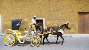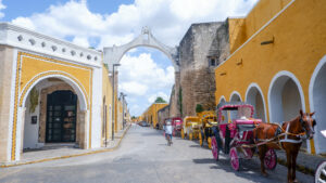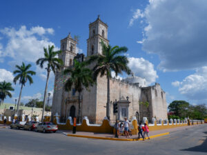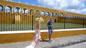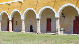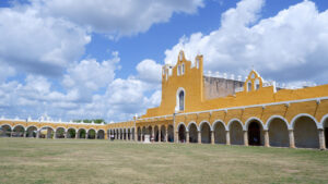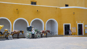 Notre découverte du Mexique continue ! Nous quittons Mérida pour Valladolid où nous dormons deux nuits. Sur la route nous allons voir Izamal, un village qui a la particularité d’être entièrement peint en jaune ocre ! Izamal s’est construit à la colonisation sur les ruines d’une cité maya, dont on peut encore voir les vestiges puisqu’une pyramide a été conservée. Vous pouvez monter dessus et profiter de la vue surplombant le village. Une fois en bas, il n’y a pas une façade qui ne soit pas jaune, ce qui donne un effet très pittoresque au lieu. Nous y croisons des calèches fleuries attrape-touristes avec leur canasson chapoté. Le centre d’intérêt d’Izamal est son monastère fondé par les franciscain au début de la colonisation. Il s’est construit sur les restes d’une structure maya, il est donc surélevé et présente un important atrium, apparemment le deuxième plus grand du monde après celui du Vatican. Aujourd’hui le monastère est habité par une communauté de soeurs.