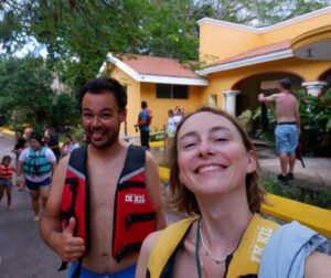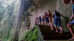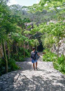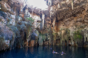 Une fois de plus il fait particulièrement chaud au Mexique, rien de mieux que d’aller faire un petit tour dans un cénote pour se rafraîchir ! Celui-ci, Tsukan, a la particularité de ressembler à une grotte dans laquelle quelques trous au plafond permettent à la lumière d’entrer. Le long des parois de grandes stalactites s’enfoncent dans les eaux profondes. Nous avons la chance d’arriver quand il n’y a presque personne et de profiter ainsi du calme du cénote. Nous apercevons même des « motmots à sourcils bleus », et oui, c’est un nom d’oiseau ! On dirait des petits martins pêcheur mais avec une queue constituée de deux longues tiges qui se terminent par une plume chacune ! Puis quelques groupes arrivent et tout devient bien moins enchanteur, il faut dire que la forme du cénote fait que ça résonne beaucoup à l’intérieur.