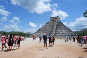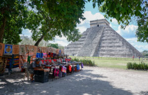 Et nous voilà réveillé par les cloches ! Après une jolie messe nous partons à la découverte d’une des 7 merveilles du monde moderne: la cité maya de Chichen Itza ! C’est un des sites les plus visités du Mexique et nous sommes dimanche, nous nous attendons à avoir beaucoup de monde. Et en effet il y avait du monde ! C’est souvent ce qui est reproché dans les guides touristiques. Pour notre part, nous avons eu beaucoup de chance depuis le début de notre voyage et nous ne pouvons pas dire que nous avons été submergés par les touristes donc ça ne nous a pas trop gênés. J’irais même jusqu’à dire que ça recrée un peu l’effervescence et le monde qui devait circuler autrefois dans ces cités ! Car il n’y a pas que des touristes à Chichen Itza, mais aussi une armée de vendeurs de souvenirs, attrape-touristes, produits artisanaux… un vrai marché qui s’étale sur tout le site. C’est assez impressionnant, ils sont si nombreux que nous nous demandons comment arrivent-ils à tous vendre quelque chose ?