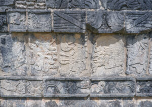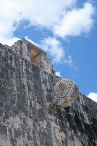 L’emblème de Chichen Itza est sa pyramide centrale, très régulière et majestueuse ! Mais ce qui nous a le plus impressionné, c’est l’imposant « juego de pelota » à l’ouest de la pyramide. Il est très bien conservé, notamment les deux anneaux centraux en hauteur mais aussi ces nombreux bas reliefs dont les sculptures sont magnifiques. Une des particularités de ce « juego de pelota » est que si nous tapons dans nos mains entre les murs du jeu, le son se reproduit exactement et nettement 7 fois.