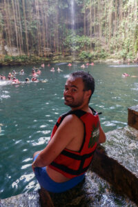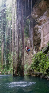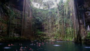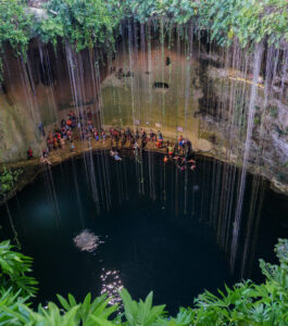 Et qui dit chaleur étouffante, dit cénote ! Après s’être rassasié, nous allons au cénote Ik Kil, tout près de Chichen Itza. Ici aussi la foule est présente ! Le cénote est assez connu, c’est un véritable trou dans le sol de 26 mètres de profondeur sur un diamètre de 60 mètres. À la surface de l’eau, il y a encore 40 mètres de profondeur en dessous. L’endroit a un aspect assez sublime avec ses lianes qui descendent sur tout le long du cénote. L’aspect merveilleux est un peu cassé par le monde qui s’agglutine dans l’eau, mais c’est assez amusant, nous pouvions même sauter de plusieurs mètres de haut.