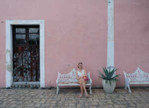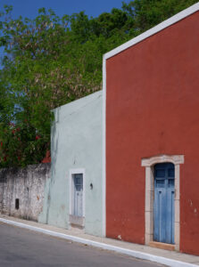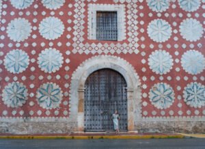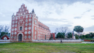 La dernière étape de cette journée bien remplie est la très jolie église d’Uayma avec sa façade très unique. Sur toutes ses faces, un fond rouge accueille de grandes rosaces bleues symbolisant l’adoration de la Vierge. En façade, nous trouvons aussi un étonnant aigle bicéphale, qui semble plus allemand que mexicain ! Un vrai coup de cœur pour Sixtine et son amour des vieilles pierres.