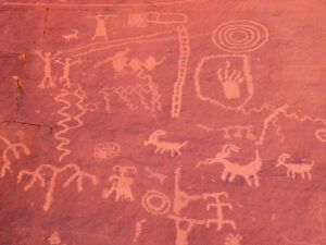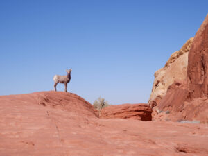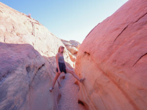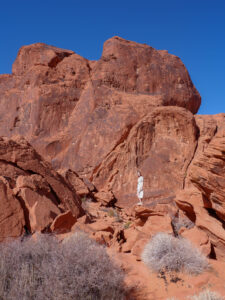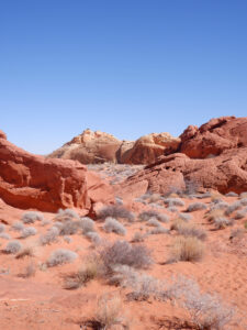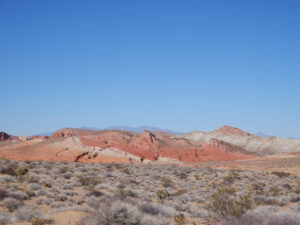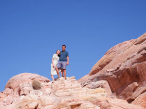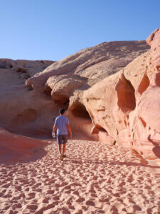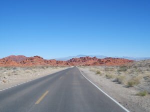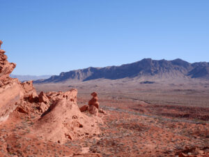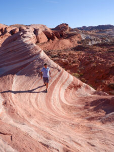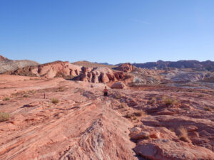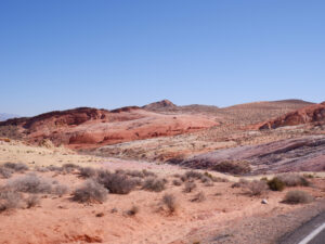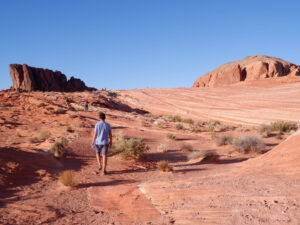 Nous quittons l’effervescence un peu fatigante de Las Vegas (qui au matin nous rappelle un peu les films « Very Bad Trip »). Nous avons comme destination la Vallée de Feu, à plus d’une heure au nord-est de la ville. Changement de décor radical, nous retrouvons nos grands paysages. La route commence à descendre en lacets, nous arrivons dans la vallée de feu. Ce qui est marquant c’est cette masse rougeâtre au milieu du paysage, nous nous avançons et commençons à comprendre que ce n’est que le début du parc. Nous y passerons deux jours à nous promener au milieu de ces roches colorées.