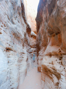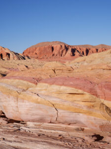 La Vallée de Feu c’est d’une part ces roches rouges briques vives qui contrastent avec les plaines vert-tendres qui entourent la vallée, et d’autre part une zone rocheuse avec des traînées de couleurs pastels : jaunes clairs, orange pêche, rose pâle, vert d’eau, terracotta… Ces deux faces de la vallée sont vraiment étonnantes autant par leurs couleurs que par leur forme. Des couleurs que nous n’avons pas l’habitude de voir en milieu naturel dans de telles quantités. La Vallée de Feu, c’est un véritable tableau. Il n’est pas évident de décrire ces paysages, le plus simple est encore de les observer à travers nos photos. En tout cas nous avons adoré y déambuler sans vraiment suivre de sentier précis, longeant ses bandes colorées, s’engouffrant dans des petits canyons rosés…