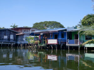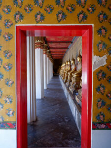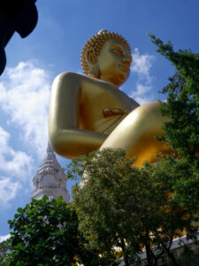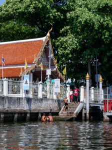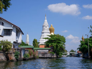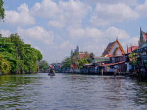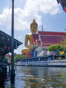 Les klongs justement ! c’est le nom donné aux multiples cours d’eau qui traversent la ville. Et oui, Bangkok est construite les pieds dans l’eau, entre le Chao Praya qui se déverse et le golfe de Thaïlande qui n’est qu’à quelques kilomètres. C’est à bord d’un petit bateau, réservé rien que pour nous, que nous parcourons les klongs de l’est de la ville… On passe une écluse et c’est parti: devant nous des petits cours d’eau, de la verdure, des petits ponts, des maisons en bois suspendues (où on se demande bien comment elles tiennent parfois)… On est loin des gratte-ciels de Sathorn ! Nous sommes dans un virage et là, comme si de rien était, apparaît un bouddha géant assis au milieu des temples, il ne fait pas moins de 69 mètres de haut, c’est le troisième plus grand bouddha de Thaïlande.