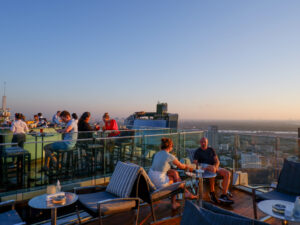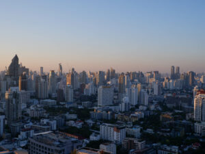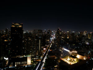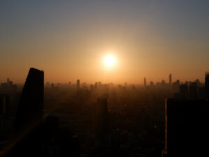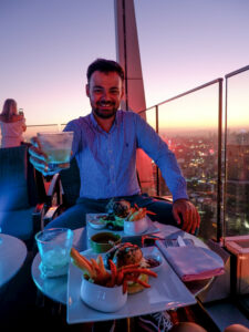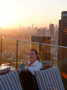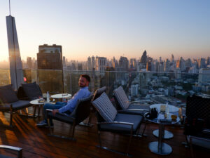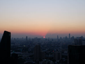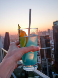 Le soir, de nouveau, changement de décor ! Nous montons en haut du Marriott, au Octave Rooftop pour un coucher de soleil qui sera absolument grandiose ! Une fois de plus l’absence de touristes joue en notre faveur, quand nous arrivons une belle table en première ligne est disponible (bon on a négocié 😉). Quel spectacle ! Sur notre tour, comme suspendu, nous observons le soleil descendre lentement à travers les gratte-ciels. Les couleurs changent et peu à peu les lumières commencent à scintiller, à s’allumer… La deuxième partie du spectacle commence: la lumineuse Bangkok s’étend dans la nuit. On sent que ça fourmille, que ça grouille ! Et en entracte ? Quelques bons cocktails et des burgers. On aura du mal à quitter cette vue tant elle est belle.