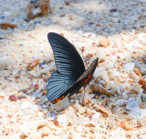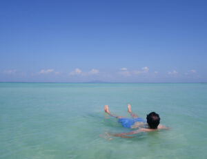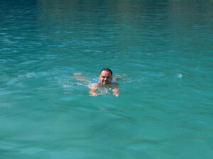 La plage est vraiment magnifique, une longue anse de sable blanc, fin, tout doux, entourée de ces masses rocheuses, l’eau est absolument magnifique, turquoise, transparente. L’ensemble est paradisiaque. Au bout de la plage nous avons eu beaucoup de chance, nous avons pu voir des petits requins à pointe noire. Nico a dit que c’était juste un gros poisson, c’est vrai que c’est assez amusant ce sont des requins mais en taille réduite, entre 40 et 50 centimètres. Leur présence est un point très positif pour la sauvegarde du lieu, la faune a repris sa place. Nous avons aussi pu faire du snorkelling (plongée avec tuba) sur l’île, nous avons particulièrement aimé ce moment, nous avons vu beaucoup de poissons différents avec plein de couleurs vives et eu l’occasion de nager avec un autre petit requin.