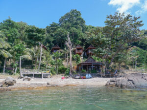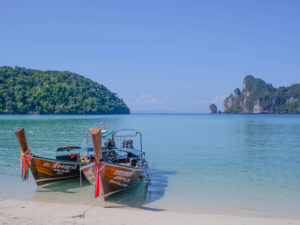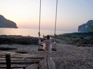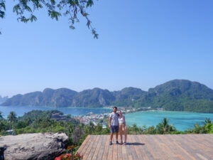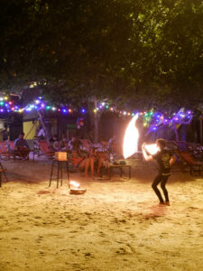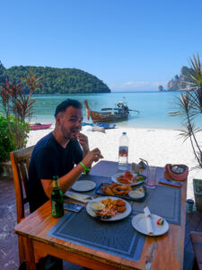 Avec le covid, on se demande régulièrement à quoi ressemblent ces lieux en temps normal. En se promenant dans Ko Phi Phi, on observe les effets du tourisme de masse (observable partout dans le sud): construction d’hôtels paradisiaques en total décalage avec les habitats thaïlandais, multiplication des commerces à souvenirs et des restaurants que les locaux ne fréquentent pas, ces ensembles remplissent les plages. Beaucoup de bars, de racoleurs, de vendeurs de « buckets » des petits seaux de plage dans lesquels on vous prépare un mélange d’alcool. Plus besoin de multiplier les cocktails, on vous met tout dans un seau !! A la tombée de la nuit, quelques bars tentent de maintenir tant bien que mal l’ambiance, musique à fond (pour chaque bar 😄) transat sur la plage et « fire show ». L’ambiance est sympa, mais étrangement… ça sonne faux. Le covid a vidé les lieux de ses touristes laissant derrière lui de nombreuses carcasses vides à la limite de l’abandon. On se sent un peu seul dans cet univers qui nécessite un peu de foule pour que l’ambiance prenne. Bon, ne pensez pas non plus que nous regrettons le tourisme de masse, ce n’est pas du tout l’idée !  C’est juste pour expliquer que dans ces lieux très touristiques, particulièrement pour tout ce qui est hôtel, restaurant, vie nocturne, c’est vide et parfois un peu triste. Une bien maigre contrainte face aux grands « avantages » de cette période covid : les paysages sont calmes, vides, les locaux reprennent leur place et ainsi les îles du sud redeviennent des petits paradis rien que pour nous.