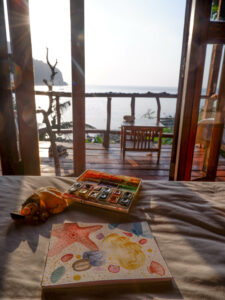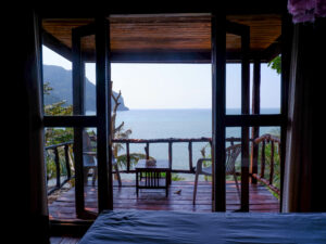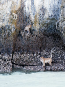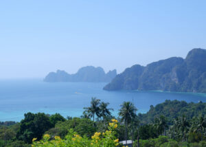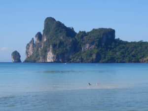 Ko Phi Phi, Ko Phi Phi… à peine arrivée j’ai déjà le sentiment que ce nom hantera nos rêves pendant encore longtemps. Dès que je l’ai vue, j’ai tout de suite été happé par cette Île, depuis le ferry elle apparait comme une muraille de montagne, verdoyante, détachée au dessus de l’eau. Dès la pointe passée, un petit port accueillant apparait. Bienvenue à Ko Phi Phi. On imagine bien que le seul point négatif qu’on pourrait trouver à ce coin de paradis et la surabondance de touristes… mais ça tombe bien pour nous, les touristes sont plutôt discrets en ce moment. Sans compter que notre hôtel est légèrement excentré. Il faut marcher 15 min sur un petit chemin qui longe la mer ou alors traverser en bateau. Là où nous sommes il n’y a nul touriste, seulement la baie, ses pics rocheux et l’horizon. Depuis notre petit bungalow suspendu, rien ne vient perturber le lente descente du soleil, la mer est calme comme de l’huile, une légère brise passe dans les arbres, et, déjà, nous tombons amoureux de cette île.