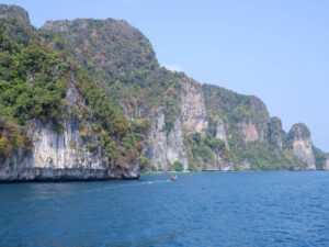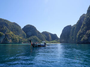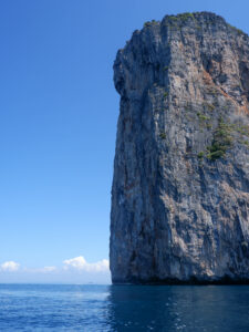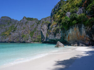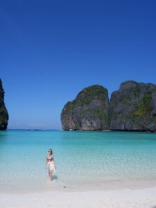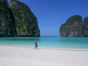 Une transition parfaite pour vous parler de la célèbre Maya Bay. Cette plage est très connue en Thaïlande. Elle se situe sur Phi Phi Ley, une île juste à côté de Ko Phi Phi. Beaucoup de voyages organisés à la journée ou à la demi-journée partent à l’exploration de cette île. Pourquoi est-elle célèbre ? La faute à Leonardo Di Caprio ! Dans le film « La Plage », le jeune Leo arrive en Thaïlande dans les années 90 et suite à une rencontre un peu perturbante il se met en tête d’aller sur une île secrète, qui dispose paraît-il d’une plage à faire pâlir d’envie le paradis. Bien évidemment elle est inaccessible et interdite. Mais il décide d’y aller quand même accompagné d’un couple de français dont les yeux de biches de Virginie Ledoyen ne le laisse pas indifférent. Je ne vous raconte pas toute l’histoire, mais ce film a créé une véritable émulation pour le tourisme thaïlandais, si bien qu’il y a 3 ans la Thaïlande a été obligé d’interdire l’accès à Maya Bay car la baie été ravagée par l’exploitation touristique. C’était des centaines de bateaux qui y déposaient l’ancre accompagnés de plus de 5000 touristes par jours… comment dire, sur les vidéos, l’affluence ressemble plus à Gare du Nord un matin classique à Paris. Évidemment, disparition de la faune dans la baie, les coraux qui se meurent… Or l’île a réouvert le 1er janvier 2022, avec une série de nouvelles règles, on accède plus à la baie par la plage, interdiction de se baigner et le nombre des voyageurs est limité (ça je n’ai pas trop l’impression que c’était respecté). Malgré ces restrictions il faut savoir que c’est l’endroit où nous avons été le plus submergés par les touristes (on part de loin aussi !).