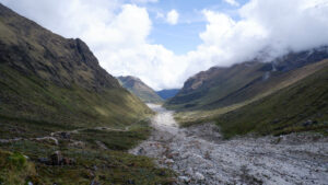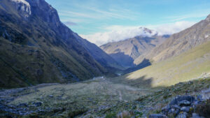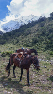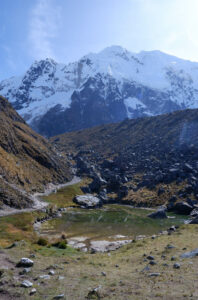 Jour 2, c’est parti ! LevĂ© 5h, nous commençons la journĂ©e dites la plus Ă©prouvante, notamment Ă cause de l’altitude, nous allons atteindre les 4600 mĂštres. Nous commençons la marche au petit jour, en remontant la vallĂ©e vers le col du Salkantay. AprĂšs une montĂ©e douce nous arrivons devant le « gringo killer ». Justement nommĂ©e, une belle sĂ©rie de lacets nous attend. La vue est toujours superbe, la vallĂ©e surplombĂ©e par le majestueux sommet enneigĂ© du Salkantay. Sur le sentier nous croisons plusieurs petits groupes de mules accompagnĂ©s de leur muletiers, il faut faire attention quand ils arrivent car les mules passent Ă toute vitesse sans trop se prĂ©occuper de votre prĂ©sence !