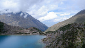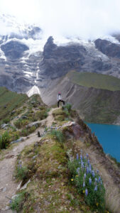 La premiĂšre Ă©tape du trek est la lagune de Humantay. Dans un cadre superbe, la marche commence doucement, il faut dire que nous avons devant nous deux heures de montĂ©e avec un dĂ©nivelĂ© de 300 mĂštres, ce qui reste raisonnable ! Ăa ne nous empĂȘche pas d’arriver bien essoufflĂ©s lĂ -haut ! Et lĂ haut quel spectacle, la lagune Ă©meraude resplendit avec au fond des filets de cascades qui descendent directement des glaciers. A notre arrivĂ©e, les sommets sont embrumĂ©s mais ils ne tardent pas Ă se dĂ©gager, rĂ©vĂ©lant les centaines de mĂštres de dĂ©nivelĂ© du sommet de l’Humantay. Pas de doute, ça valait le coup de monter jusqu’ici. Pour cette altitude, la faune est Ă©tonnamment riche, une particularitĂ© pĂ©ruvienne selon notre guide. Tout autour de la lagune se massent des fleurs bleues jaunes et blanches, qui rendent le lieu encore plus enchanteur.