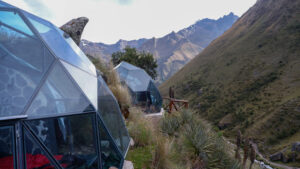 Puis nous redescendons ! C’est Ă moment que nous nous rendons compte qu’il y a un autre couple de français, Ben et Marine, dans le groupe. Cela fait prĂšs de quatre ans qu’ils voyagent et travaillent. En effet, ĂȘtre traducteur est un mĂ©tier qui peut ĂȘtre tout Ă fait nomade. Cette vie doit ĂȘtre incroyable, mais nous nous disons que nos proches et le vin finiront par dĂ©finitivement nous manquer ! Nous descendons donc puis remontons quelque peu dans la vallĂ©e, oĂč se trouve notre lieu de camp pour cette premiĂšre nuit. Il est 14h et nous sommes impatients de dĂ©jeuner. La bonne surprise est que le lieu dispose d’une vraie salle fermĂ©e pour s’asseoir et dĂ©jeuner tous ensemble en face dâun panorama sur les montagnes. Le dĂ©jeuner est dĂ©licieux, nous sommes ravis… mais aussi trĂšs fatiguĂ©s ! La marche, l’altitude et le lever Ă 4h commence Ă se faire ressentir. DĂšs la fin du dĂ©jeuner nous ne rĂȘvons que de rejoindre nos pĂ©nates ! D’autant plus que nous avons rĂ©servĂ© notre nuit dans des petits dĂŽmes de verre, pleine vue sur la vallĂ©e et le mont Salkantay. Nous nâallons pas se mentir, c’est vraiment grandiose d’ĂȘtre dans cette petite bulle suspendue. Devant nous une vallĂ©e verdoyante oĂč s’Ă©coule doucement un cours d’eau et oĂč broutent tranquillement les chevaux. De notre bulle, aprĂšs un petit dodo, Sixtine observe des Andean Caracara planer dans la vallĂ©e, et bien trop vite le soleil se couche sur le mont Salkantay.