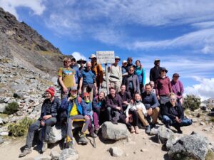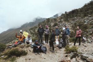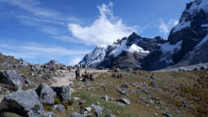 Nous rejoignons le groupe, montons dans le van, tentons de dormir sur le chemin qui mĂšne au point de dĂ©part du Salkantay trek. 4h30 plus tard, aprĂšs une route mouvementĂ©e, nous y sommes. Le dĂ©but du trek nous attend ! Devant nous, l’immense sommet enneigĂ© du Humantay apparaĂźt avec ses 4200 mĂštres d’altitude, alors que nous sommes à « seulement » 3200 mĂštres. Nos guides font les prĂ©sentations, nous sommes deux groupes d’une douzaine de personnes qui finiront par voyager tous ensemble. La taille du groupe n’est pas gĂȘnante, c’est mĂȘme plutĂŽt sympathique. La diversitĂ© des nationalitĂ©s prĂ©sentes est impressionnante: slovĂšnes, allemands, nĂ©erlandais, brĂ©siliens, amĂ©ricains, anglais, belges…. Les guides font tout pour crĂ©er une cohĂ©sion de groupe et ça fonctionne bien !