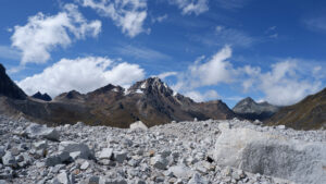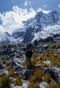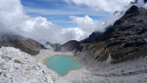 Nos guides nous emmĂšnent ensuite Ă travers un amas de grosses roches jusqu’Ă ce qu’apparaisse une belle lagune bleue turquoise au milieu de ce paysage rocheux. Angel et Virgilio, nos guides, commencent Ă nous expliquer l’aspect symbolique et sacrĂ© des montagnes, appelĂ© « Apu », une sorte d’ĂȘtre protecteur. Ainsi Ă chaque expĂ©dition ils font un petit rituel pour remercier la montagne et faire un nouveau vĆu.