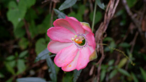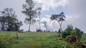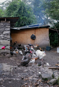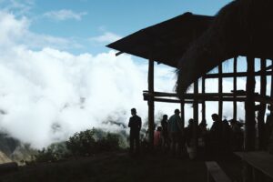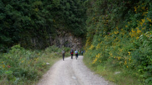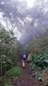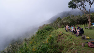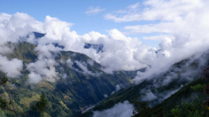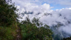 Jour 4. Certainement la plus grosse journĂ©e de ce trek mais une fois de plus le programme s’annonce splendide. LevĂ© 5h encore une fois, nous commençons directement Ă monter sur 700 mĂštres de dĂ©nivelĂ© pour bien se rĂ©veiller. La pente se fait au fur et Ă mesure au milieu des nuages. Le sentier est magnifique et calme. Le groupe sâĂ©tale rapidement en fonction du rythme de chacun, nous croisons toutes sortes de fleurs, d’oiseaux sauvages⊠et domestiques: dindons et poules se promĂšnent un peu partout. Peu Ă peu notre versant commence Ă se dĂ©gager laissant apparaĂźtre les montagnes prises dans les nuages.