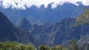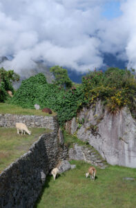 Au sommet de cette montĂ©e sportive nous attend notre premiĂšre vue sur le Machu Picchu. L’arrivĂ©e est un peu théùtrale, une plaine verte qui laisse apparaĂźtre Ă mesure qu’on avance l’Ă©tendue du spectacle. Une large vue sur une sĂ©rie de montagnes vertes et rocheuses. Au centre nous apercevons au loin des terrasses: c’est le Machu Picchu ! Les nuages vont et viennent le faisant apparaitre et disparaitre. Les montagnes majestueuses l’entourent. Nous comprenons pourquoi le Machu Picchu a Ă©tĂ© construit lĂ : il est bien entourĂ© de ses « Apu », les montagnes protectrices. Nous nous reposons quelque temps sur cette plaine splendide. Chien, mules, chat, poulet se promĂšnent Ă la recherche d’un petit bout de gĂąteau ou d’une caresse. Les chiens au PĂ©rou sont plutĂŽt de grand gabarit et trĂšs affectueux (pas tout Ă fait comme les chiens fous d’Ayutthaya en ThaĂŻlande).