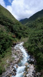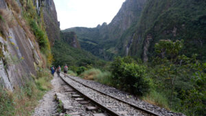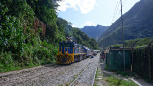 Pourtant la marche est loin d’ĂȘtre terminĂ©e. AprĂšs un dĂ©jeuner Ă Hydroelectrica, nous longeons les rails du train jusqu’Ă Aguas Calientes, le village au pied du Machu Picchu. Ce joli chemin, interrompu parfois par le train qui passe, longe le cours d’eau agitĂ© du rio Urubamba. Pas moins de trois heures et demie plus tard, nous atteignons bien Ă©puisĂ©s notre destination ! En rĂ©compense, le fameux cocktail local Pisco Sour pour tout le monde !