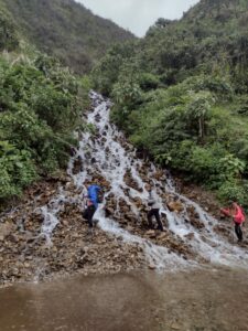 A prĂ©sent c’est la grosse descente qui nous attend, pas moins de 1000 mĂštres… Sixtine apprĂ©hende un peu car elle a dĂ©jĂ bien mal aux genoux ! Avec un peu de peine et bien du courage nous atteignons enfin le cours d’eau. Nous traversons un pont suspendu et nous reposons Ă l’ombre avec les papillons.