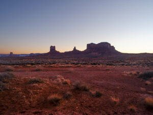 Monument Valley, Sixtine l’attendait avec impatience ! Il faut dire que c’est LE paysage américain des westerns, des cowboys et des indiens ! Une fois de plus tout est grandiose, ces grosses masses rocheuses qui trônent majestueusement dans la vallée. Elles sont là, impassibles, massives presque sacrées ! Les couleurs sont rouges orangées, la végétation très sèche se résume à ces petits buissons verdâtres qui peuplent les plaines.