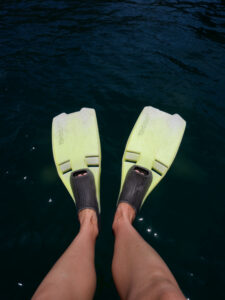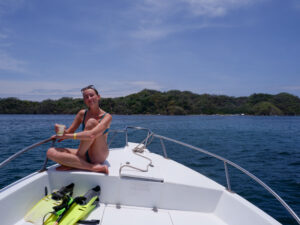 Il est temps à présent d’en voir un peu plus… Destination du jour: Las Islas Tortugas. Et non rien à voir avec un quelconque repère à pirate ! Nous prenons le bateau directement depuis la plage de Montezuma et remontons la côte pendant environ 45 minutes. Ce qui nous laisse le temps de découvrir un littoral très sauvage, préservé de l’homme. Sur la route, quelle chance nous croisons un banc de dauphins que nous pourrons observer de très près ! Rien que pour ça, la journée est rentabilisée pour Sixtine. Las Islas Tortugas est un ensemble de toutes petites îles non loin de la côte. Elles ne sont pas habitées, seule la plage dispose de quelques aménagements, le reste est 100% sauvage. Nous commençons la journée par une session snorkelling. Palme, masque et tuba, c’est parti ! L’eau est parfois un peu trouble. Il faut dire qu’ici la mer est agitée et se prête plus au surf qu’à la plongée. De plus, il arrive qu’il y ait des nappes de fines algues orangées qui viennent troubler la surface de l’eau. Nous observons cependant de beaux poissons aux multiples couleurs.