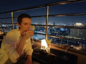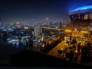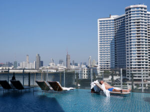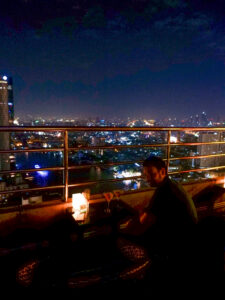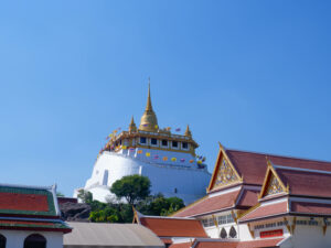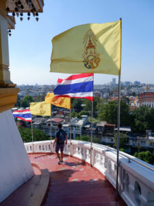 Concrètement qu’avons-nous fait ? Le premier jour nous sommes partis à pied de l’hôtel direction le centre historique où nous avons rencontré notre fameux chauffeur de tuk-tuk, après nous avoir emmené chez un marchant de costume et dans une agence de tourisme alors que nous souhaitions faire plusieurs temples nous avons réussi à nous faire amener au Wat Intharawihan (Wat veut dire temple) où nous avons dit au revoir à ce petit monsieur. Nous avons pu admirer un beau bouddha debout d’une trentaine de mètre. Une fois dehors nous nous dirigeons vers le Phra Sumen Fort, une petit fort militaire dans un joli parc, puis vers Wat Saket, le célèbre temple/montagne dorée de Bangkok ! L’endroit est magnifique avec une vue splendide sur toute la ville. Après tout ça nous rentrons à l’hôtel, sa magnifique piscine nous attend… La fin de la soirée s’écoule doucement avec un bon burger (très local non ? 😉) et des jeux de sociétés.