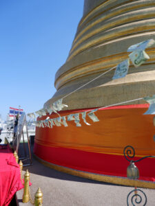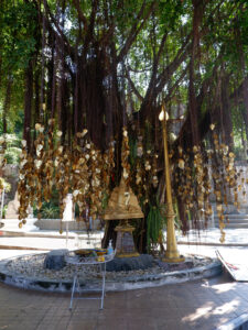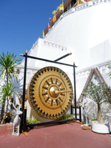 Continuons sur les temples, car c’est ce que nous avons vu en majorité ! Pics dorés, mosaïques brillantes, motifs colorés et … beaucoup, beaucoup, beaucoup de bouddhas. Des bouddhas assis, couchés, debout, big bouddha, old bouddha … Des petits et des grands, le plus grand faisait 43 mètres ! Les pratiques du bouddhisme sont multiples : des couronnes de fleurs, des billets suspendus (la théorie de Nicolas est qu’ils sont là pour sécher), des petits cœurs métalliques avec des vœux inscrits dessus, de l’encens, des pièces à mettre dans des sceaux à la suite, le gong, les séries de cloches à sonner… Il faut entrer pied nu dans les temples et surtout ne jamais mettre en avant ses pieds devant bouddha (il n’aime pas ça). Pour moi l’architecture est un vrai plaisir, les formes et les structures ne ressemblent en aucun cas à ce qu’on peut voir en Europe. Tout est nouveauté pour nous et surtout inconnu : chaque élément à un nom et une fonction bien précise que nous ne situons pas du tout !