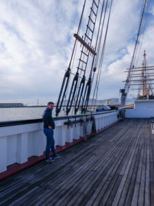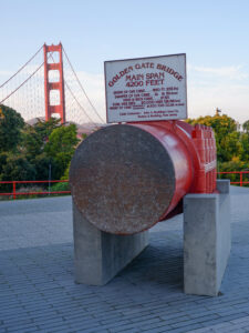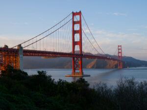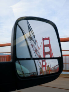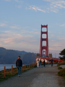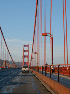 Revenons à cette première nuit ! Sixtine a repéré un endroit qui s’annonce prometteur. Il s’agit d’un parking point de vue sur le Golden Bridge, rien que ça ! Apparemment la réglementation permet d’y rester 8h, de jour comme de nuit. Sur les applications de campings, il est particulièrement recommandé car il a une vue panoramique sur toute la baie de San Francisco: Bay Bridge, le centre financier, la ville et au bout, le Golden Bridge ! C’est parti, nous traversons la ville, ça monte et ça descend, puis nous découvrons pour la première fois le pont rouge très emblématique de la ville au coucher du soleil ! Les rayons du soleil viennent raviver le rouge, rendant le Golden Bridge encore plus flamboyant. Il est vrai que ce monument est particulièrement grandiose et très photogénique. C’est un des monuments les plus visités des États-Unis ! Petit fun fact: si on prend tous les câbles qui constituent le Golden Bridge, on peut faire trois fois le tour du monde ! Pour l’explication: les gros câbles sont en réalité constitués de centaines de petits câbles, c’est eux qui sont comptés 😉. Puis enfin, il est temps de traverser le pont, un petit instant mythique !