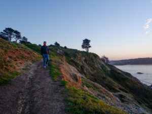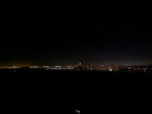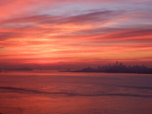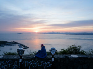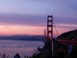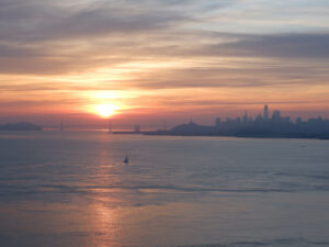 Nous voilà à notre parking, nous nous mettons en première ligne et savourons la vue de la ville de nuit qui scintillent de mille feux, avec à droite le pont illuminé. Il est temps de se coucher, avec un peu d’appréhension, espérant qu’un ranger ne viendra pas nous déloger ! Et non, la nuit se déroule sans encombre. Nous nous réveillons tout juste pour le lever du soleil et sortons dehors emmitouflés dans nos duvets. Là le spectacle est encore plus grandiose que la veille… Le soleil se lève juste derrière San Francisco, avec toutes ses couleurs !